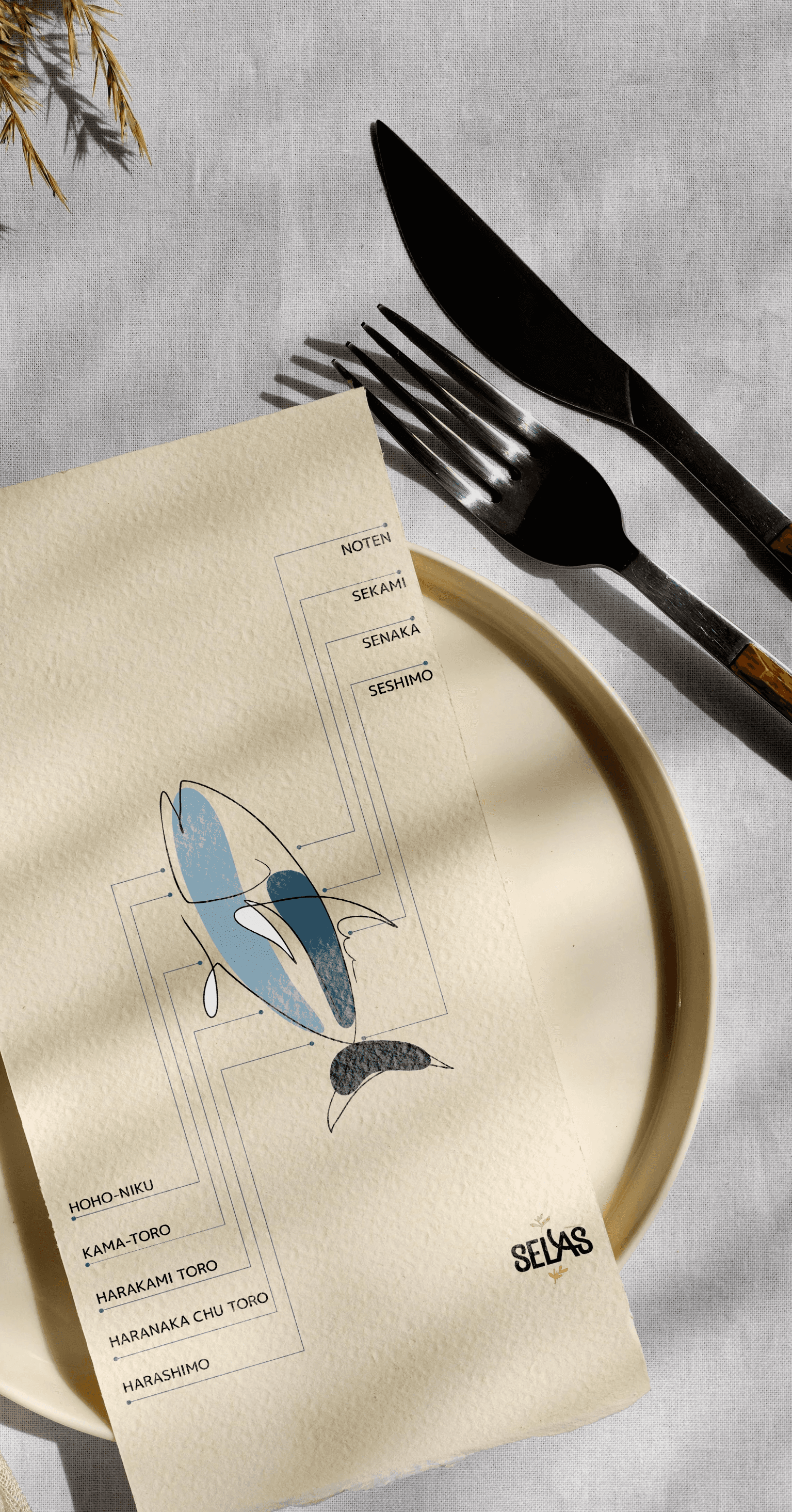 With the chef's help, I created a filleting map that was placed on each table. I illustrated the tuna to give it a slightly less emotionally triggering appearance, while subtly marking the locations of the cuts the diners will see during the live demonstration.